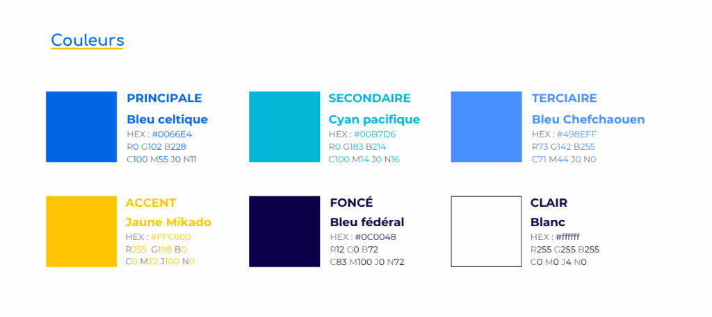 L’identité graphique repose sur une palette de bleus vibrants et un jaune lumineux qui affirment une posture à la fois rigoureuse, optimiste et digitale :