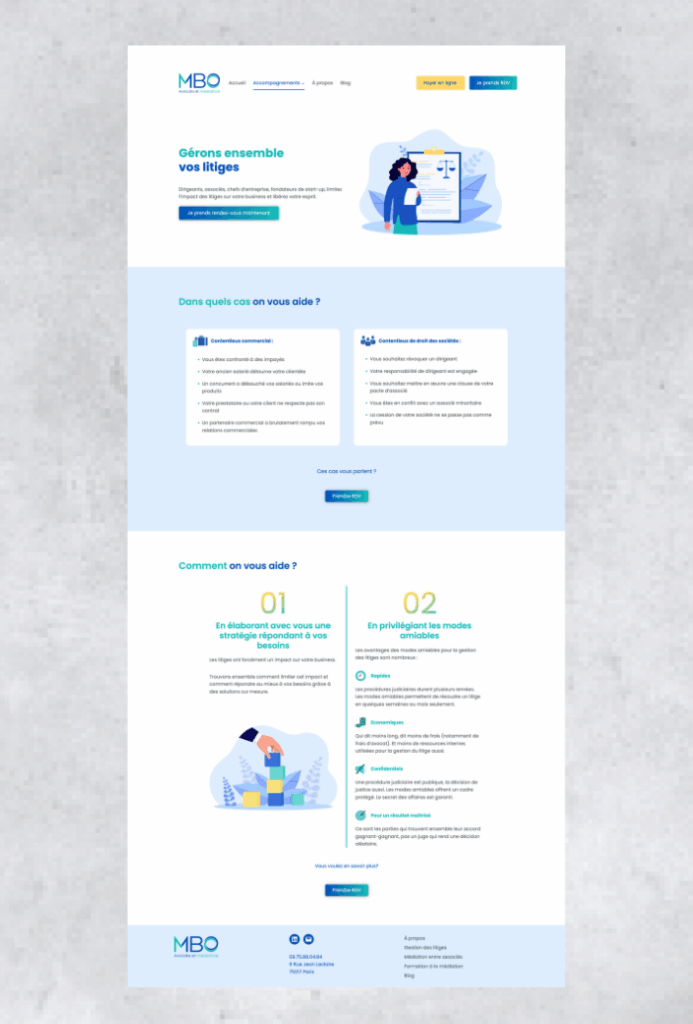 Site web (mbo-avocat.com) pensé comme une vitrine dynamique au style épuré inspiré des codes SaaS,