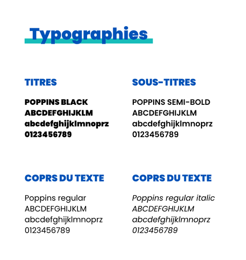 Nous avons choisi la typographie Poppins (Black / Semi-bold / Regular) pour sa lisibilité et son design arrondi, qui transmet une autorité douce et accessible.